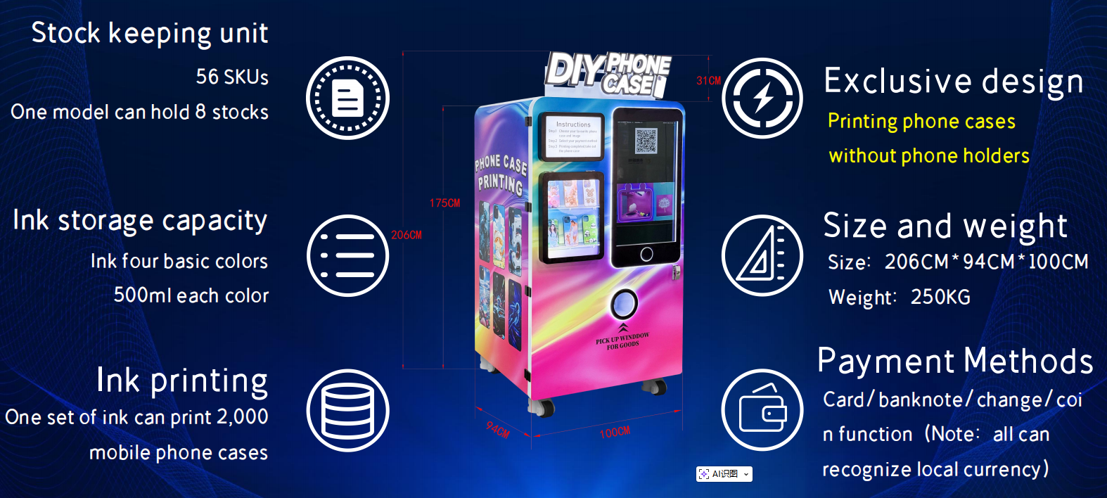 インク:全4色のインクで、充填後に200個の携帯ケースを印刷することができます。